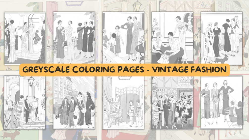 Vintage Women Coloring Pages, Vintage Fashion Coloring Pages, Greyscale Coloring Pages, Original Art, Coloring Pages for Adults, Not by AI